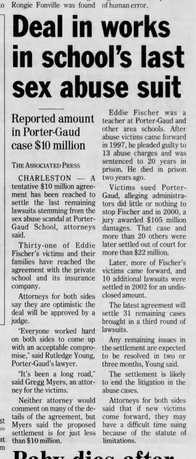 Lay employee Eddie Fischer taught at the prestigious Episcopal Porter-Gaud School in Charleston, South Carolina from 1972 to 1982. Subsequently he taught at College Preparatory School and James Island High School. He was discovered to have abused 20 boys at Porter-Gaud, and as many as 50 total. Fischer was arrested in 1997 largely as a result of persistent efforts by one of his victims, Guerry Glover, whose father Harold Glover filed a civil suit against Porter-Gaud the following year. In April 1999, Fischer was sentenced to 20 years in prison. In October 2000, following Fischer’s incarceration, a court determined that principal James Bishop Alexander and headmaster Berkeley Grimball knew of the abuse by Fischer. The jury deemed both negligent. Neither Alexander nor Grimball were convicted, as each died prior to the court concluding. However, the court awarded the initial plaintiffs $105 million. Fischer died in prison in 2002. Additional settlements through 2004 with other victims were made in the amounts of $10 million and more than $22 million.